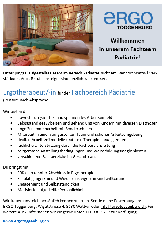 Wir sind immer auf der Suche nach motivierten Ergotherapeutinnen oder Ergotherapeuten. Melde dich gerne auch bei uns, wenn du an einer Stelle im Fachbereich Neuro/Geriatrie oder Hand interessiert bist. Auch Studienabgängerinnen oder Studienabgänger sind herzlich willkommen bei uns!